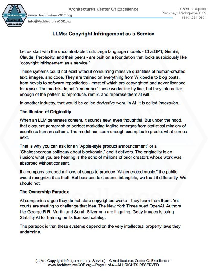 Let us start with the uncomfortable truth: large language models - ChatGPT, Gemini, Claude, Perplexity, and their peers - are built on a foundation that looks suspiciously like “copyright infringement as a service.”