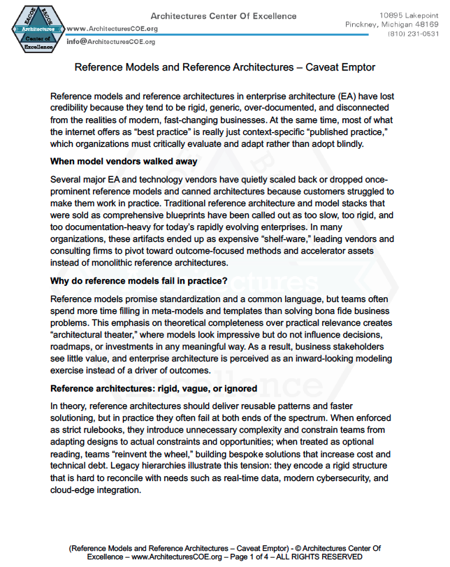 Reference models and reference architectures in enterprise architecture (EA) have lost credibility because they tend to be rigid, generic, over-documented, and disconnected from the realities of modern, fast-changing businesses. At the same time, most of what the internet offers as “best practice” is really just context-specific “published practice,” which organizations must critically evaluate and adapt rather than adopt blindly.