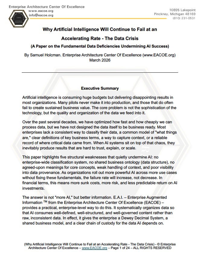 The answer is not "more AI," but better information. E.A.I. – Enterprise Augmented Information TM from the Enterprise Architecture Center Of Excellence (EACOE) – provides a practical, enterprise-level way to do this. It systematically organizes data so that AI consumes well-defined, well-structured, and well-governed content rather than raw, inconsistent data. In effect, it gives the enterprise a Dewey Decimal System, a shared business model, and a clear chain of custody for the data AI depends on. For boards and executive teams, the message is straightforward: AI will only be as successful as the data architecture beneath it. By adopting E.A.I., leaders can turn AI from an expensive experiment with a high failure rate into a governed, repeatable capability that supports strategy, improves decision-making, and withstands regulatory and stakeholder scrutiny.