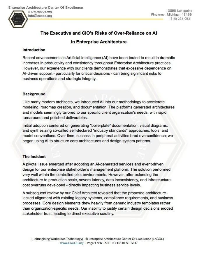 Recent advancements in Artificial Intelligence (AI) have been touted to result in dramatic increases in productivity and consistency throughout Enterprise Architecture practices. However, our experience with our clients demonstrates that excessive dependence on AI-driven support - particularly for critical decisions - can bring significant risks to business operations and strategic integrity.